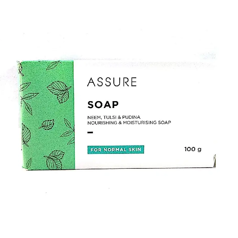 - Assure soap is a unique blend of Neem , Tulsi and Pudina . Itprotects the skin without drying it out . It also disinfects and refreshes theskin leaving it feeling fresh “